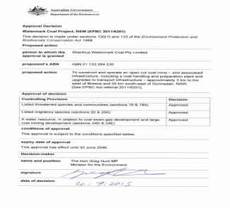 PA官方平台沃特马克项目于 2015 年取得新州政府的《开发许可》和联邦环境部的环评批复,获得了澳洲矿业开发的核心审批。